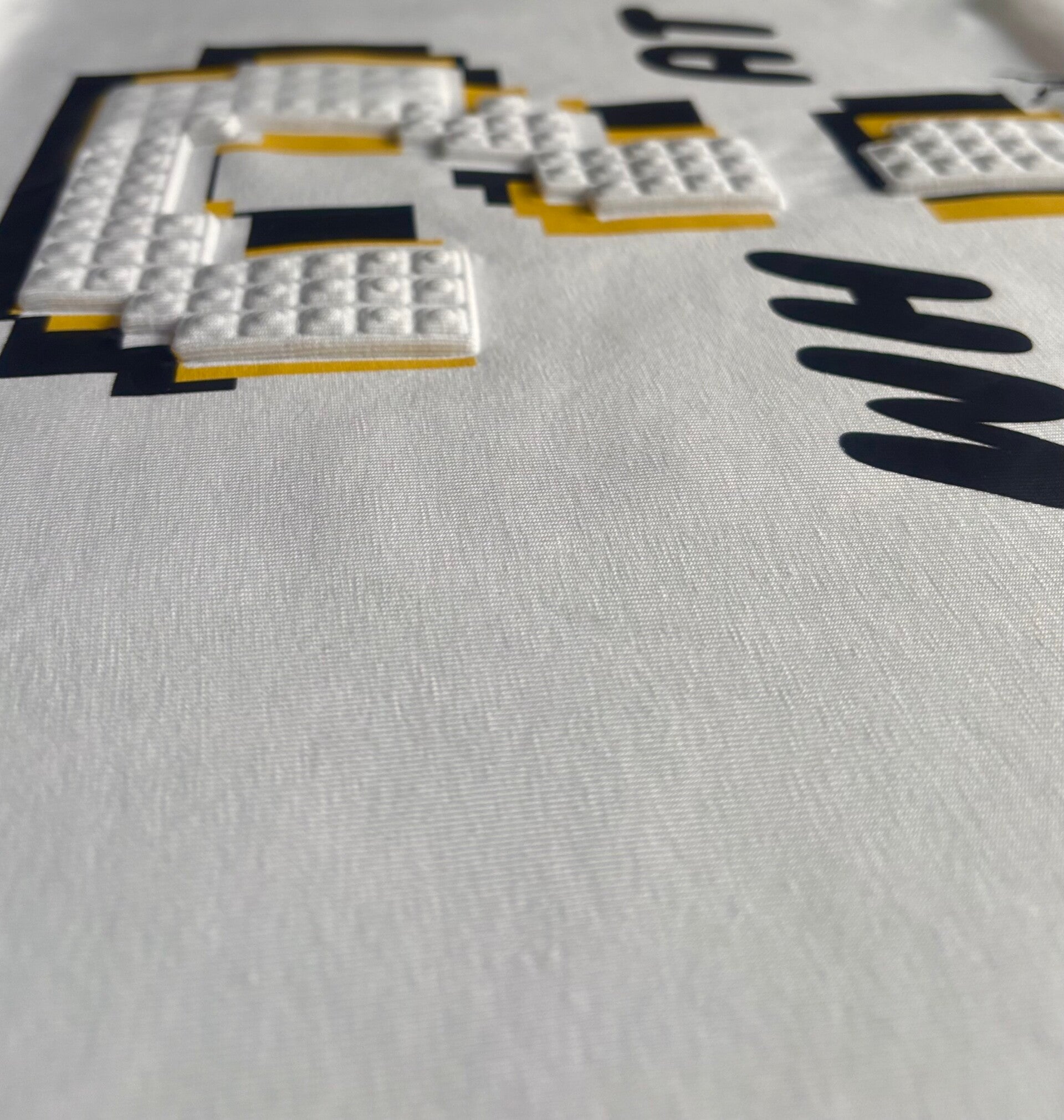 Combined 3D printing on T-shirts and hoodies. A combination of raised heat emboss printing and surface printing with special effects (leather look, textures, graphic finishes). Premium appearance with high durability. Production from 50 pieces.