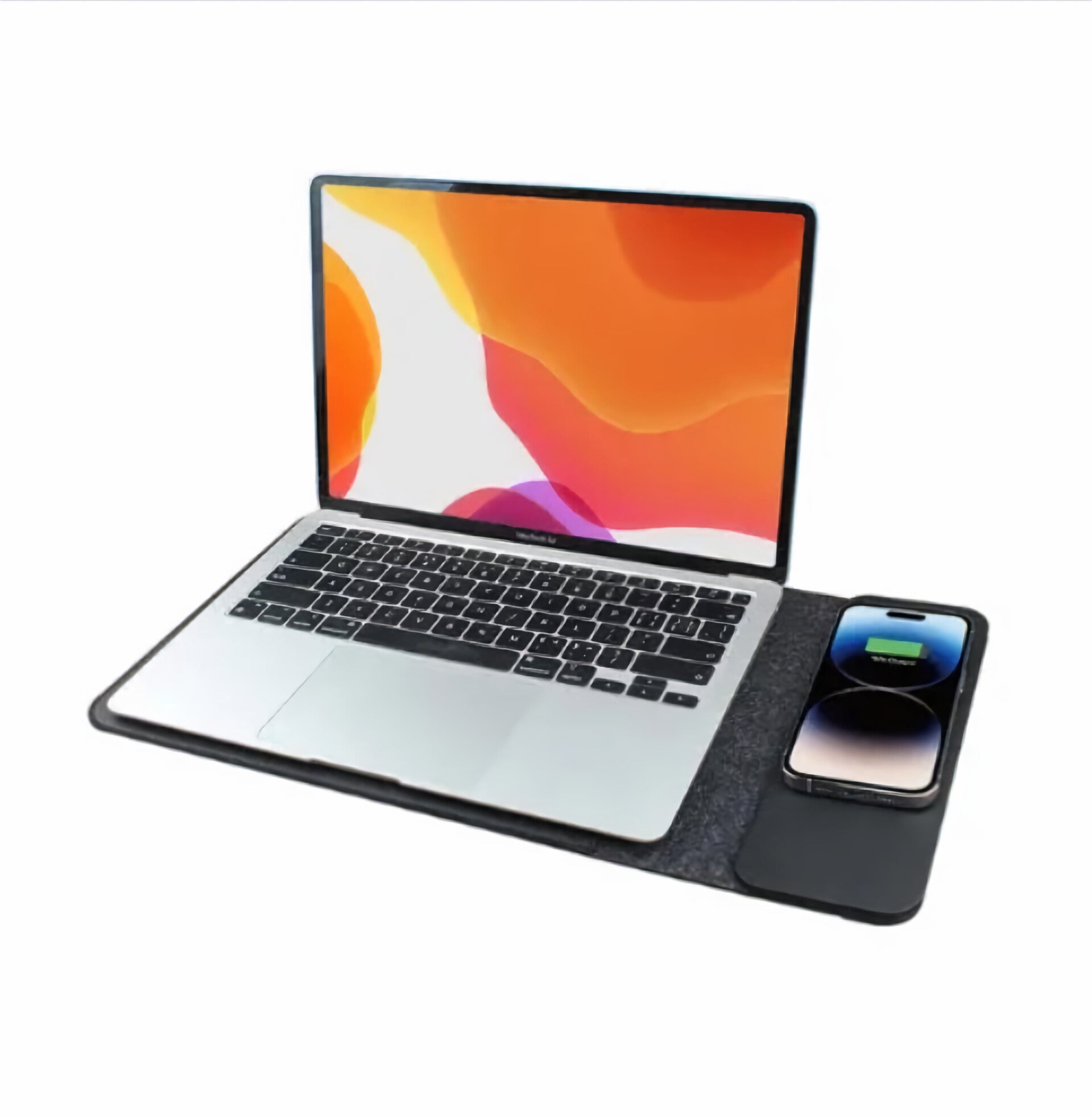 An elegant and practical accessory for the modern professional. Crafted from durable water-repellent PU leather and soft felt made from recycled materials, it combines style, functionality, and long-lasting quality. Presented in an exclusive gift box, it makes an excellent choice for corporate gifts. Equipped with two wireless charging zones, it allows you to charge multiple devices simultaneously, providing comfort and convenience in your daily work.