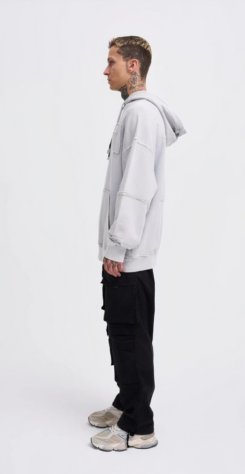 Oversized hoodie made of boiled cotton code 3237OPS and premium 3-thread fleece (320–350 g/m²) featuring a washed effect, decorative exposed seams, and a large textured back design combined with bold text print, offering a modern streetwear look with a relaxed fit, dropped shoulders, and a deep hood; available in light grey and beige as shown, with a wide color palette that allows customers to choose any desired shade, making it ideal for merchandise, corporate apparel, and fashion collections, while supporting various branding methods such as DTF printing, screen printing, embroidery, and more.