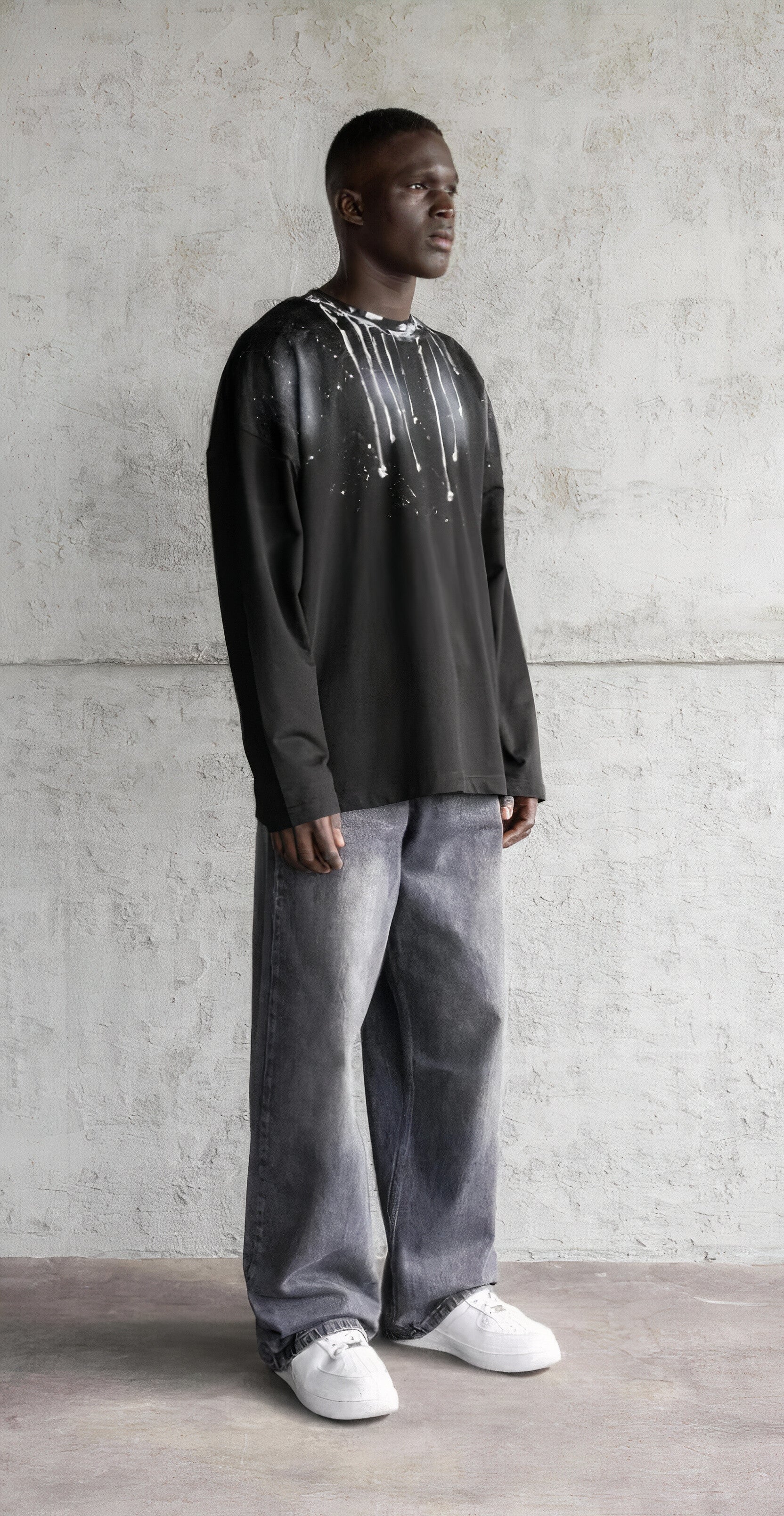 Oversized sweatshirt code 3240OPS made of premium 3-thread fleece (320–350 g/m²) featuring a bold paint-drip style print along the neckline, creating an artistic streetwear look; the relaxed silhouette with dropped shoulders and long sleeves ensures a comfortable fit, while the dense fabric maintains its shape and durability, making it suitable for everyday wear and fashion collections. Additional colors are available upon request, and your logo can be added using DTF printing, screen printing, or embroidery.